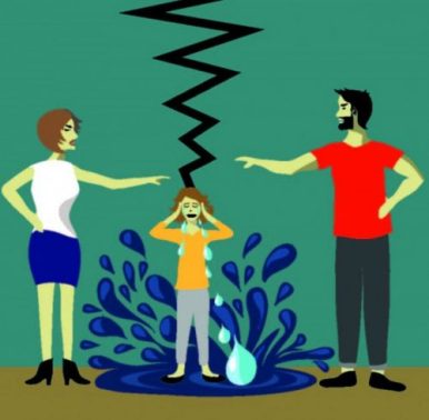 Parental conflict is confusing to the child. Both parents seem focused on fighting while the child between them is understandably upset.